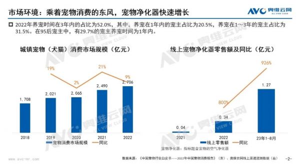 宠物消费逐年增长,宠物空净仍是蓝海据《中国宠物行业白皮书》显示,城镇宠物消费市场5年都处于较高速的增长状态,且有望持续维持,从消费结构来看,宠物用品从2021年的12.8%提升到2022年的13.3%,占比持续增长,而在养宠人群的画像中,3年以内的宠物主占比达到50%以上,而在95后宠物主中,有接近30%的宠物主养宠时间在1年之内。他们对新事物接受程度高,且因为养宠时间较短,更容易成为宠物净化器的目标客户。而聚焦到宠物净化器,我们可以看到,随着消费复苏和人们对生活品质的重视度的提升,也拉动了宠物空净市场现在的快速增长,从市场阶段来看,整个宠物空净市场尚处在起步阶段。