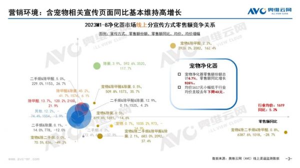 而扩展到整个宠物空气净化器行业,我们也能得到相似的结论,以2023年1-8月线上分价格段宠物空气净化器TOP10来看,中高端宠物净化器品牌普遍缺乏专业产品,大多是以常规产品加宠物相关宣传为主,专业产品的缺失是阻碍宠物空气净化器均价提升的主要原因。而这也正是新入局者的机会,在足够的品牌力和出色的产品加持下,宠物空净同样具有冲击高端市场的潜力。