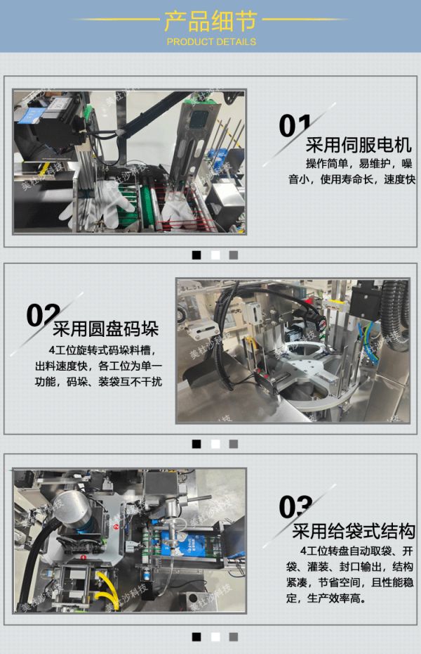 自动取袋、开袋、入袋、充填、排气、封口、输出,可完成背封型包装袋的多片式物料的包装;有产量统计功能、自带故障警示灯,显示屏提示故障原因功能,采用优质的不锈钢和零件等不容易生锈的金属材料;各工位有单独可屏蔽运行的功能,无料不灌装,无料不封口。