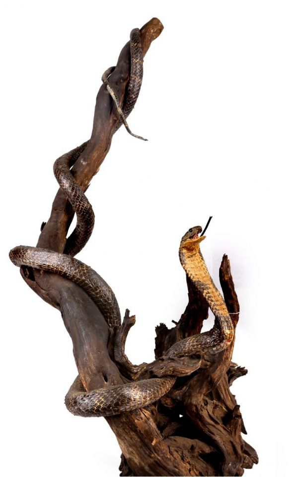 在展览现场,最为吸引人的无疑是盘踞在树枝之上的巨大眼镜王蛇,它是收藏于重庆自然博物馆中的珍贵标本之一。