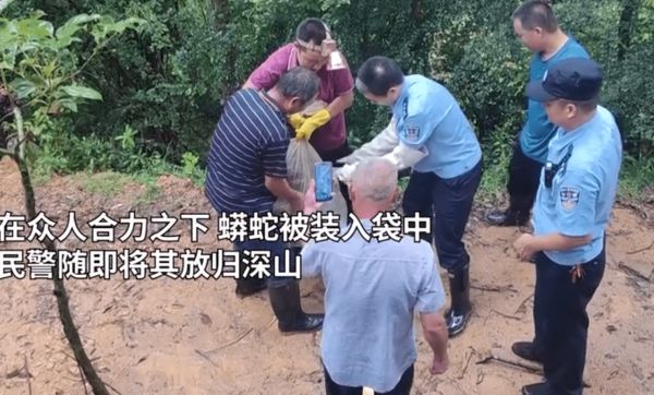 蟒蛇“闯进”村落,警民携手放生
