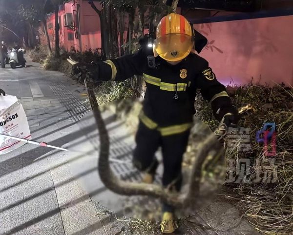 2024年5月13日,深圳龙岗爱南路绿化带树上也发现过一条约20斤的蟒蛇,消防迅速捕获并移交动物保护协会