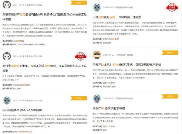 理赔环节更是纠纷重灾区。黑猫投诉平台数据显示,“宠物、保险”相关投诉量达1890余条,众安、国泰、大地等保险公司均榜上有名。小红书、微博等社交平台上,亦有大量用户吐槽报销流程繁琐、审核严格、理赔遭拒。