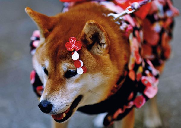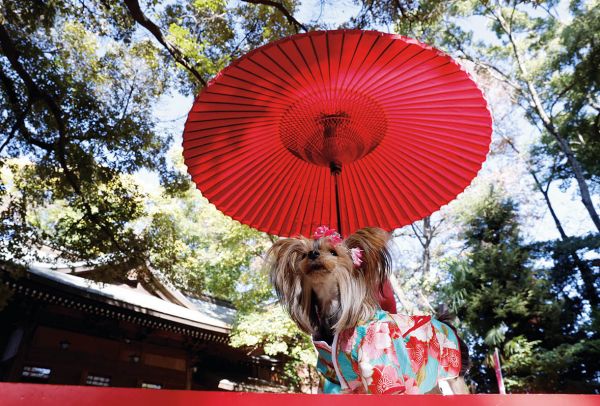 在日本神奈川县座间市的座间神社,身着盛装的宠物狗参加“七五三”节活动