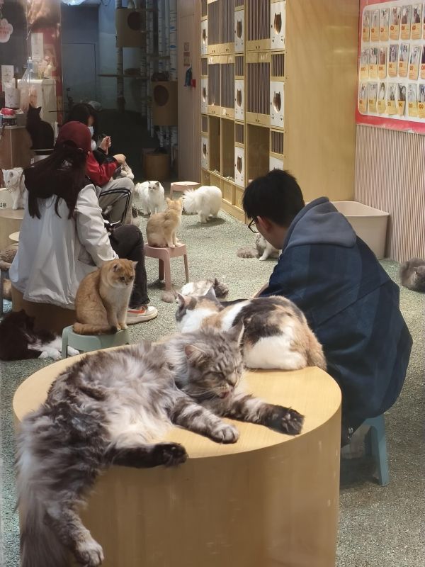 顾客们在猫咖内撸猫在五棵松商圈一家人气颇高的猫咖内,几名顾客正在惬意地撸猫,墙上贴着几十只猫咪的图片和介绍、撸猫说明以及“喵星人肢体语言”介绍。收款台和撸猫区的门上贴着告示,所有猫均接种过猫三联、狂犬疫苗,但记者未见到公示检疫证明。工作人员明确告诉记者,猫都打完了疫苗才放进去,不会拿顾客的生命开玩笑。