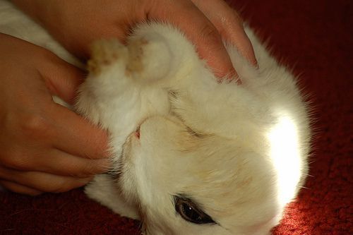 兔子的脚上主人不要直接接触,要给自己好好戴上手套。先用剃刀把兔子的脚上的有癣处的毛发给剃除干净,再观察下面的皮肤,如果没有什么异常,就用双氧水来好好清洁干净。双氧水干透之后,主人就要对准兔子清洁好的皮肤,喷上兔净选。兔子的脚上痒痒的,兔子可能会想要挠自己,所以主人这个时候可以给兔子戴上伊丽莎白圈,这样它就没有办法挠自己了。
