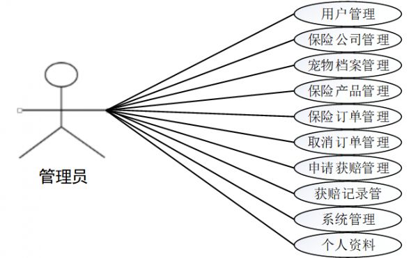 本文提出了一种基于面向对象的思想方法,以适应系统的实际功能与性能要求。为了使宠物投保管理更具自动化和亲和力,在对宠物投保系统进行简单的需求分析之后,将其分为三大功能模块,分别为管理员、用户和公司。其用例如下: