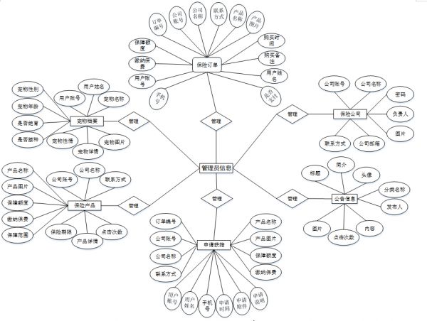 E-R图是由实体及其关系构成的图,通过E-R图可以清楚地描述系统涉及到的实体之间的相互关系。在系统中对一些主要的几个关键实体:将“宠物档案、保险产品、保险公司、保险订单、申请获赔、公司信息”等作为实体,它们的局部E-R图,如图4-3所示: