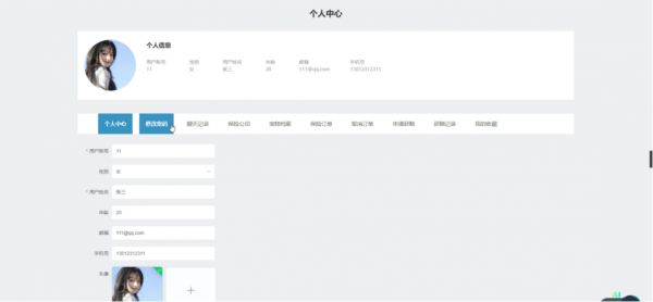 5.1.3公司个人中心公司:在个人中心页面可以对个人中心、修改密码、聊天记录、保险产品、保险订单、取消订单、申请获赔、获赔记录、我的收藏等进行详细操作;如图5-7所示:
