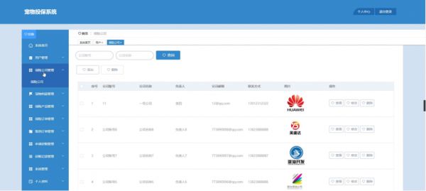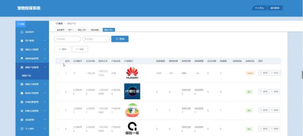 后台管理:用户、保司、宠物、产品、订单、取消、理赔、公告、评论、权限、系统配置