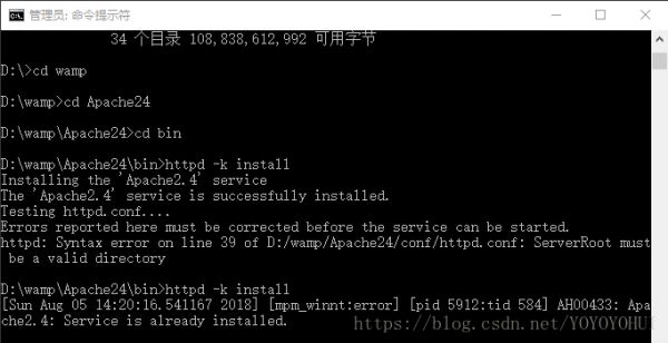 根据你的电脑配置来下载是32位的还是64位的。这里我在D盘创建了一个wamp的文件夹,将下载好的apache解压在该目录下。接下来以管理员的身份运行cmd,然后一步步进入到d:wampApachebin目录,在该目录下执行httpd -k install 命令,