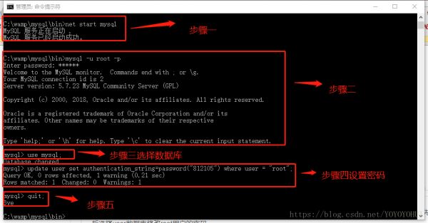 然后重启MySQL(net stop mysql/net start mysql),此时可以不用密码进行连接,但许多功能受到了限制。先连接MySQL,然后选择user数据库修改root用户的密码。