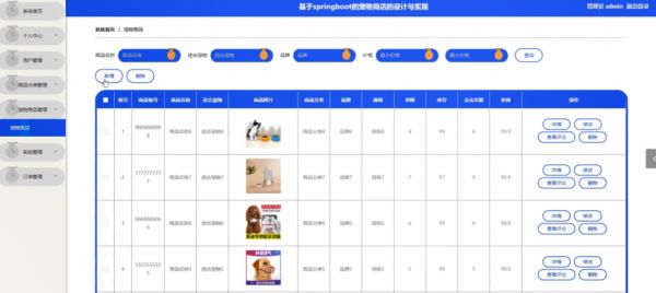 管理员点击宠物商品管理,在宠物商品管理页面的输入商品编号、商品名称、适合宠物、商品图片、商品分类、品牌、规格、单限、库存、点击次数、价格等内容,进行查询、新增或者删除宠物商品等操作,如图5-11所示。