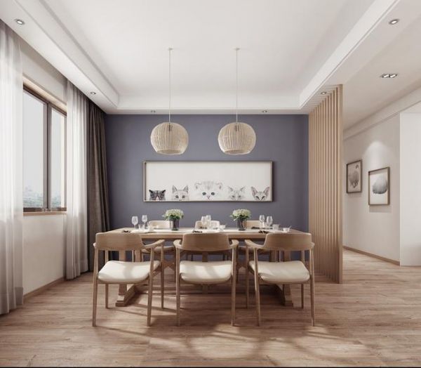餐厅原木色的餐桌椅散发着自然的气息,两盏暖色吊灯为餐厅营造安静且具有艺术格调的用餐氛围,高级灰的背景墙简约而不失优雅,挂画中几只探出头的猫主子仿佛在宣示着主权。