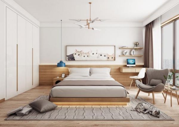 卧室兼做床头柜的小猫宅让猫主子即使在夜晚也不会孤单,这是你能给它的最细致的陪伴。延伸到墙面的木质面板,让卧室背景墙独具特色;兼做梳妆台使用的多功能工作台,小巧精致而不输颜值。温暖的午后,阳光洒在极具北欧风色彩的休闲椅,你在看着书,猫主子在地毯上打着呼噜。