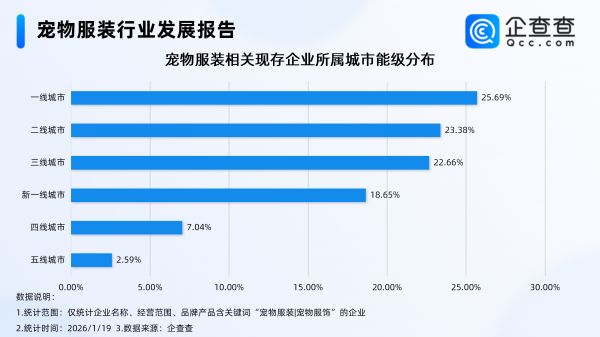 企查查数据显示,截至1月19日,国内宠物服装相关企业现存量达1827家,从城市能级分布来看,分布在一线、二线、三线的相关企业量较为均匀,均占比超20%,一线城市宠物服装相关企业最多,占比达25.69%。