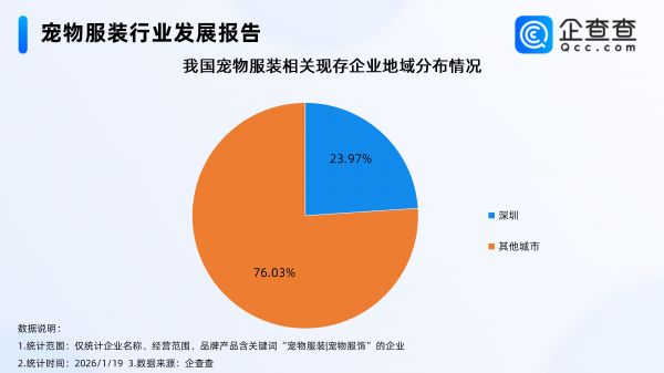 企查查数据显示,截至1月19日,国内宠物服装相关企业现存量达1827家,从城市能级分布来看,相关企业多分布在一线、二线、三线,均占比超20%,一线城市宠物服装相关企业最多,占比达25.69%。其中,深圳以超400家相关企业,在全国占比达23.97%。从国标行业分布上看,相关企业集中分布在批发和零售业、制造业,分别占比56.74%、21.08%。注册量方面,2022年以来,宠物服装相关企业年注册量均不过百家,2025年注册量达53家,同比增长89.29%。