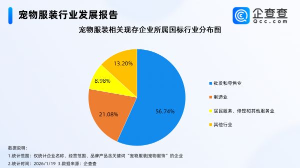 企查查数据显示,从国标行业分布上看,宠物服装相关企业集中分布在批发和零售业、制造业,分别占比56.74%、21.08%。注册量方面,2022年以来,宠物服装相关企业年注册量均不过百家,2025年注册量达53家,同比增长89.29%。