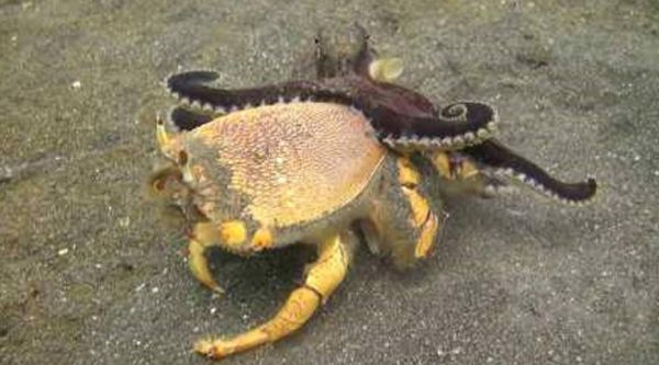 #宠物# 螃蟹被章鱼缠上,三两下被掏空,果然八只手的生物不好惹