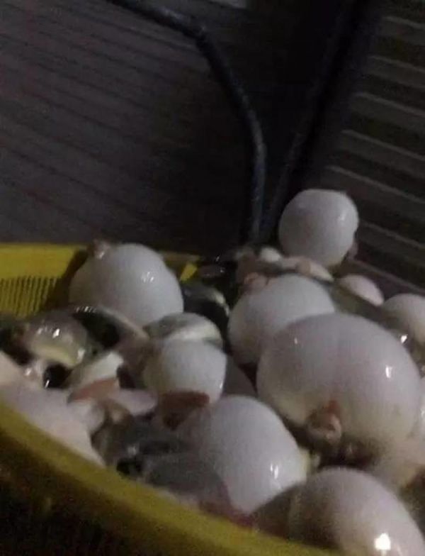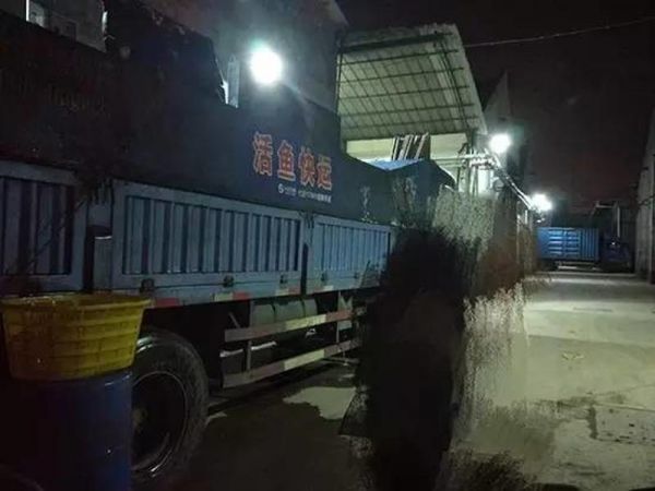 晚上10点过,一辆写着“活鱼快运”的货车正在卸载活体河豚鱼。