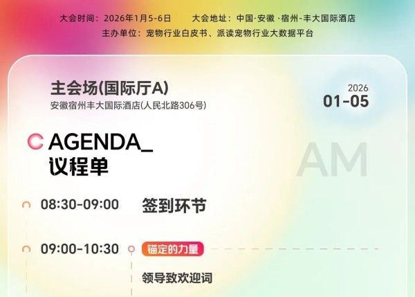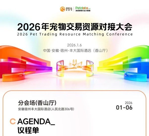 而在本次直播结束后,由宠物行业白皮书,派读宠物行业大数据平台主办、福建贝创投资发展集团有限公司,安徽恩宠有加宠物用品有限公司联合主办、安徽省宠物行业协会,华南农业大学动物科学学院,赣南创新与转化医学研究院,宿州市宠物经济商会协办、北京派读科技有限公司,宿州市广播电视台承办的2026年宠物交易资源对接大会将于将于2025年1月6日在宿州丰大国际酒店隆重举行。