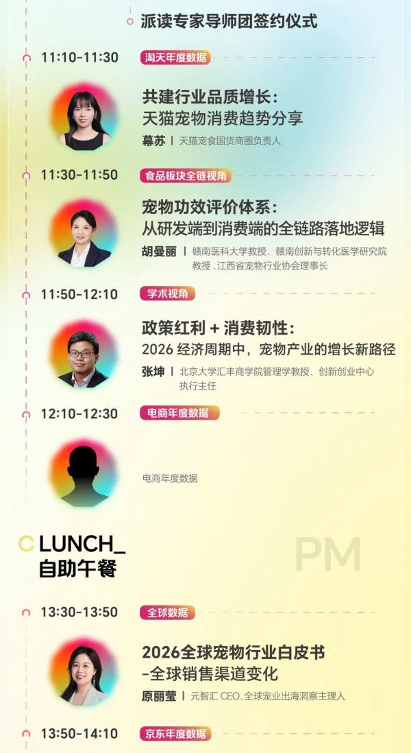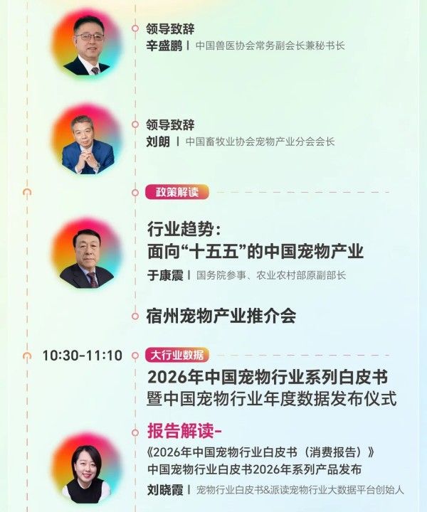 本次大会将重磅发布《2026年中国宠物行业白皮书(消费报告)》《全球宠物行业白皮书》《2026中国宠物交易报告》等核心报告,还将联合淘天、京东、抖音、小红书首次实现宠物板块年度数据同台发布,更设有政企合作、跨界创新、活体交易资源对接、派读奖名单公布等专题环节,为宠物行业从业者搭建“学、论、展、投、秀”全链路交流平台。