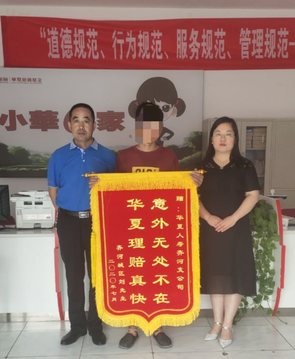 大众网·综合 8月4日,华夏保险客户刘先生一早来到齐河支公司职场,为公司送来了一面金灿灿的锦旗,以表达对公司快速理赔的感谢之情。