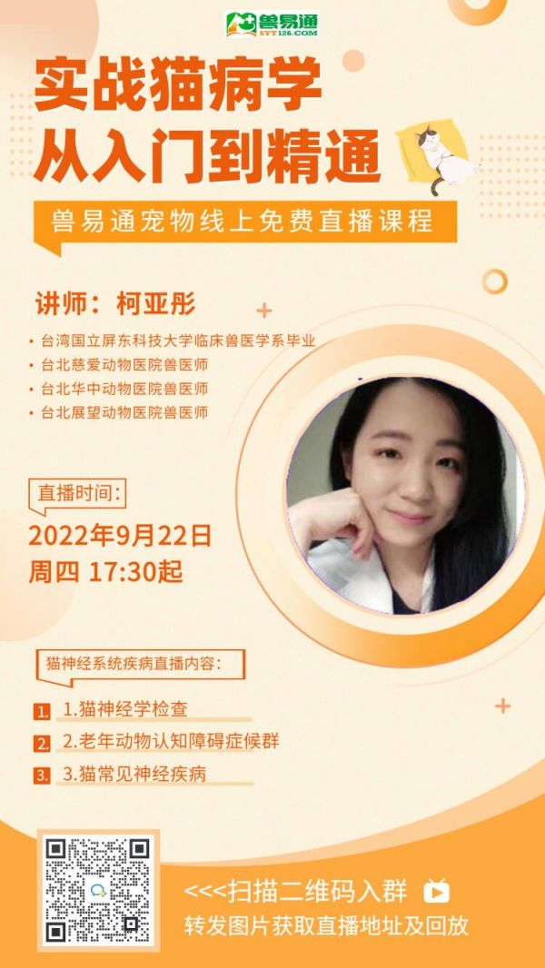 本周四,柯亚彤讲师将为大家带来《实战猫病学,从入门到精通》!兽易通特别邀请台湾猫病学专家为各位兽医师完整、系统的讲授猫病学课程。结合临床病理给大家不一样的教学新思路。