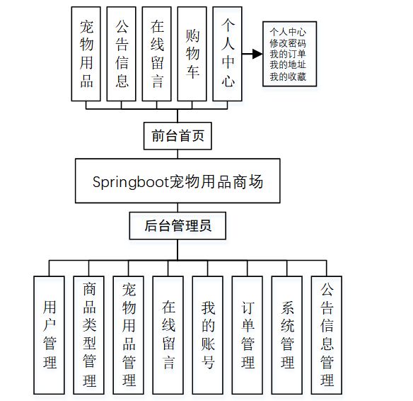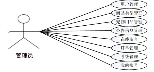 管理员模块:管理员是系统中的核心用户,管理员登录后,可以对后台系统进行管理。主要功能有我的账号、用户管理、商品类型管理、宠物用品管理、公告信息管理、在线留言、系统管理、订单管理等功能。管理员用例如图3-2所示。