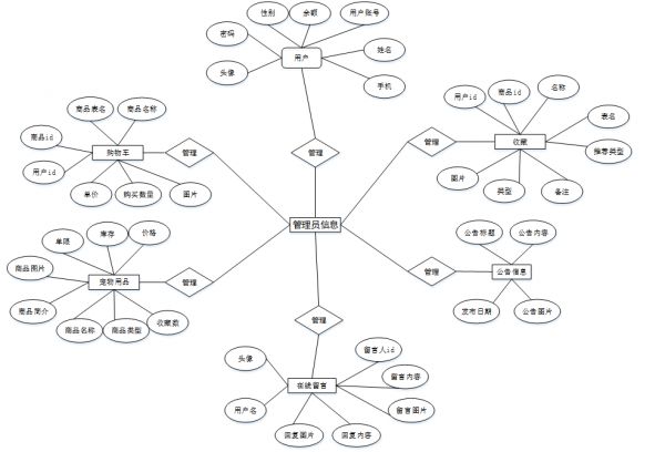 4.3.1 数据库E-R图设计E-R图即实体-联系图,主要作用是提供了解显示数据类型存在的联系的途径,是藐视现实世界的概念模型,其关键要素是实体型、属性、联系。以下将本系统的“用户、宠物用品、购物车、公告信息、在线留言、收藏”等作为实体,它们的局部E-R如图4-3所示: