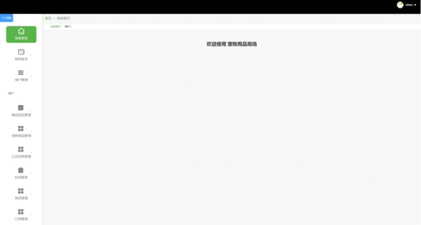 管理员进入主页面,主要功能包括对我的账号、用户管理、商品类型管理、宠物用品管理、公告信息管理、在线留言、系统管理、订单管理等进行操作。管理员主页面如图5-7所示: