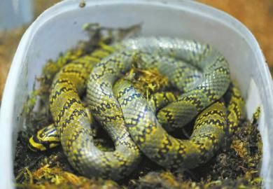 这条横斑锦蛇通身黄绿,不到拇指粗。它的“丈夫”,则在不远处的另一个盒子里。