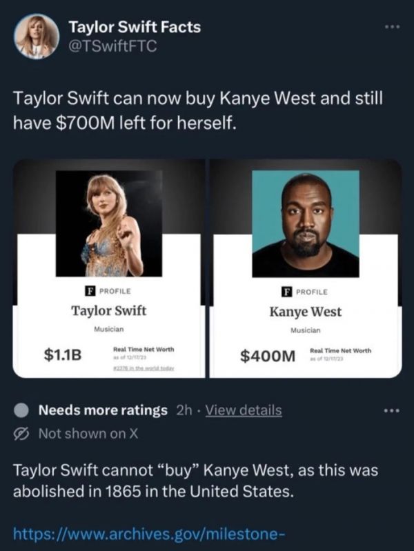 甚至还被网友玩梗,目前的泰勒买下Kanye还余下7亿美元......