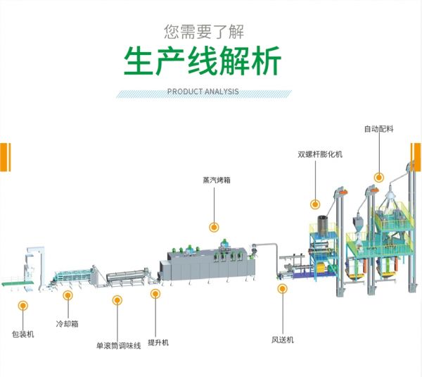 5、生产流程:原料混合→挤压膨化造粒→干燥→调味→冷却→包装(设备配置灵活)