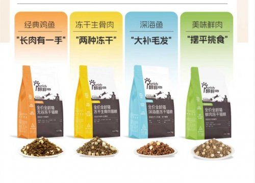 醇粹是上海的品牌,猫粮代工厂是浙江科盛宠物食品有限公司,纯粹旗下的宠物食品比较全,猫、狗食品都有,且均包含了主食、零食产品,尤其狗粮还细分了小、中、大型犬分别推出了不同的产品。这款无谷冻干猫粮有好四个口味的,每个口味的主粮用的原料不一样,添加的冻干种类也完全不一样,四个口味是鸡肉+深海鱼类的组合。另外,不同口味的猫粮颗粒也各不相同,有圆形颗粒、三角中空颗粒、十字形颗粒,总之就是各个方面都很丰富。