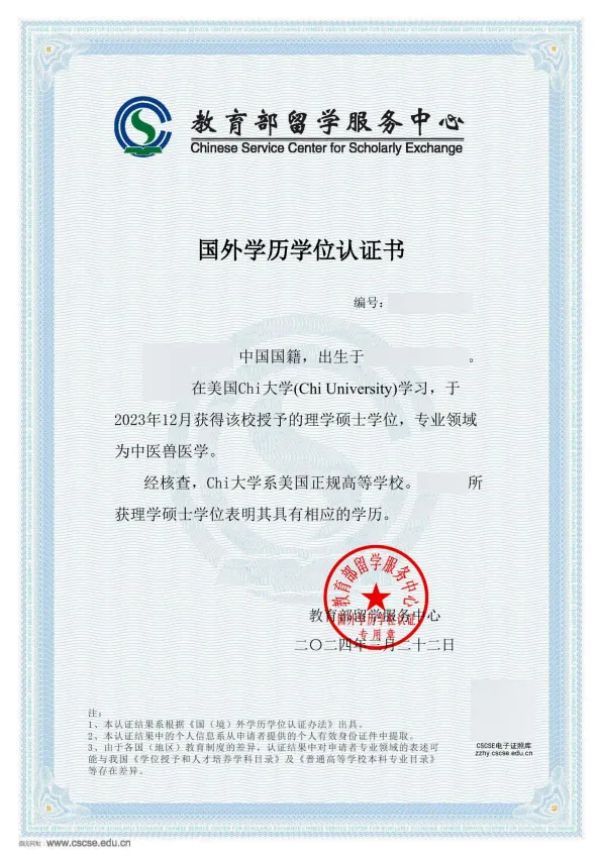 Chi University荣幸地宣布,在致力于提供卓越兽医教育和扩展全球合作伙伴关系的不懈努力中,我们已正式获得中国教育部留学服务中心的学历认证!
