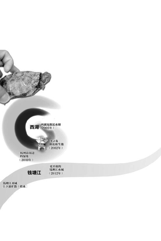 净寺及附近放生池(2002年)——西湖及附近水塘(2005年)——杭州市周边的湿地(2010年)——更开放的钱塘江水域(2012年)——钱塘江水域上下游扩散(将来)。