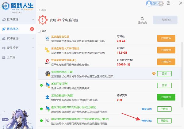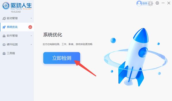 1. 安装最新版驱动人生,完成后打开驱动人生,进入左侧栏的“系统优化”,点击界面中的“立即检测”进行系统扫描。