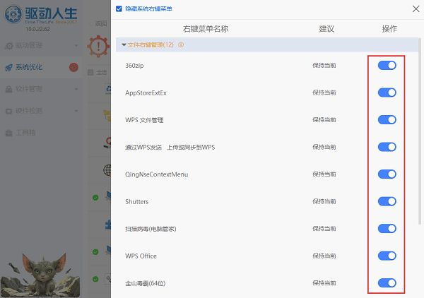 驱动人生不仅能检测驱动,还提供系统优化功能,其中包含右键菜单管理模块。它可以扫描所有右键扩展,让你以开关方式快速控制是否启用,非常适合不想手动操作注册表的用户。