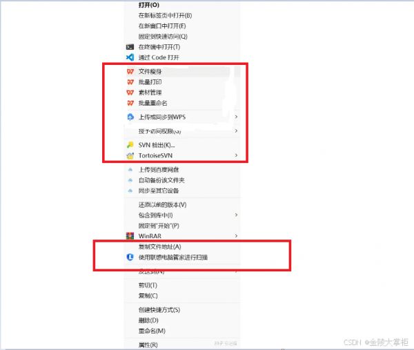 升级到Win10或Win11的小伙伴们可能都会发现,新的版本中鼠标右键菜单太多了,如下图所示,WPS文件瘦身、WPS批量打印等不常用的功能都显示出来了,就导致菜单过长看着极不方便,尤其是菜单最下方的“删除”等常用功能需要打开折叠才能看到,很不爽!!!