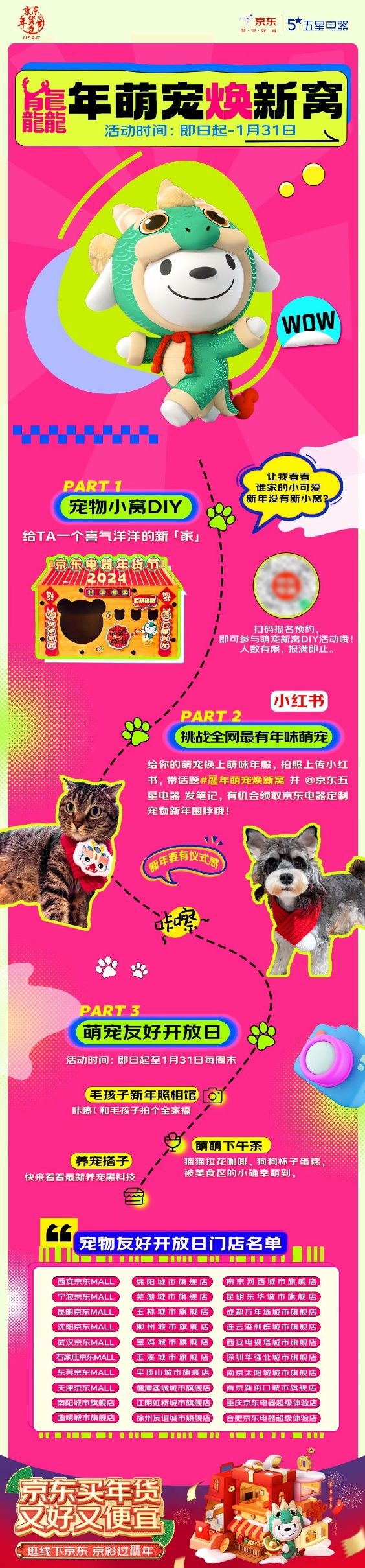 作为城市打卡新地标,京东五星电器在此次年货节特别开放“宠物友好日”,即日起至1月31日每周末,京东电器、京东五星电器线下指定门店(门店地址详见配图)准备了DIY猫窝、毛孩子照相馆、萌宠下午茶、宠物小家电免费体验等到店活动,同时,线上发布小红书相关笔记即有机会得宠物小围脖、猫窝等精美小礼品。