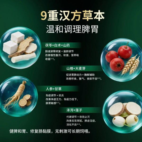 摒弃了简单的成分添加,深度借鉴中医“脾胃论”与“君臣佐使”组方思想。配方精选茯苓、山药、山楂等九味天然草本,旨在从根源上温和调理脾胃功能,改善消化吸收能力,形成“治养一体”的长效呵护。