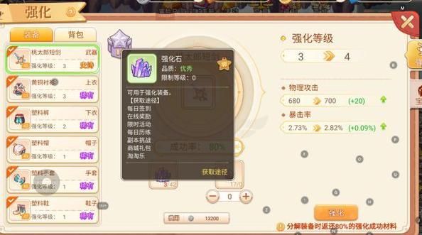 前期强化系统实用性较低,主要因为强化石获取困难,且装备更换后强化等级无法继承,导致多数玩家不愿投入资源。在条件充足的情况下,可将装备强化至9级左右,若资源有限也可暂时跳过此阶段。需注意的是,当强化等级达到9级后,成功率会显著下降,此时可借助装备强化晶石提升成功概率。即便强化失败,装备也不会损坏,仅会降低强化等级。目前强化系统的最高等级为20级,玩家可根据自身情况合理规划强化节奏。