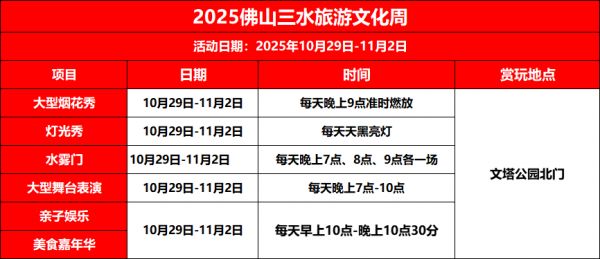 自10月29日起至11月2日,三水旅游文化周活动精心设置四方美食区、广东美食区、本地美食区、包装手信区、本地文化、公益摊位和亲子娱乐区,每晚更有璀璨烟花汇演,与精彩舞台表演轮番上演,为大家呈现一场全民共享的文旅盛宴。