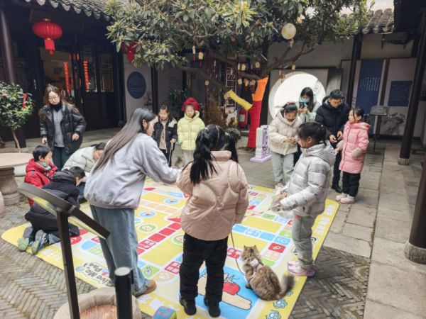 庭院中央铺设的巨型飞行棋成为全场焦点。棋盘格子上写着各类趣味任务:“模仿猫咪叫声”“回答一个文史小问题”“与猫咪完成一次击掌”……每当骰子落地,总会引发一阵期待与欢笑。