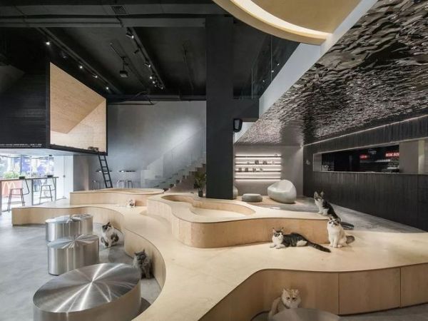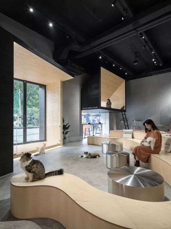 开敞的猫型梯田取代传统的座位排列,通过梯田的地势起伏形成人与猫不同的行为尺度,猫咪穿梭于梯田,带来有趣的互动。