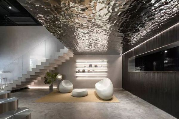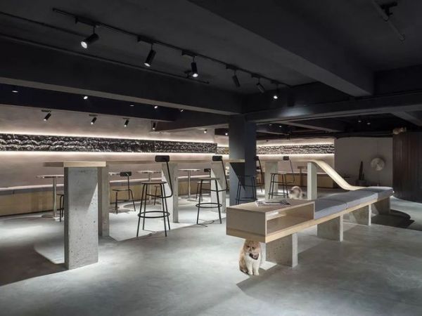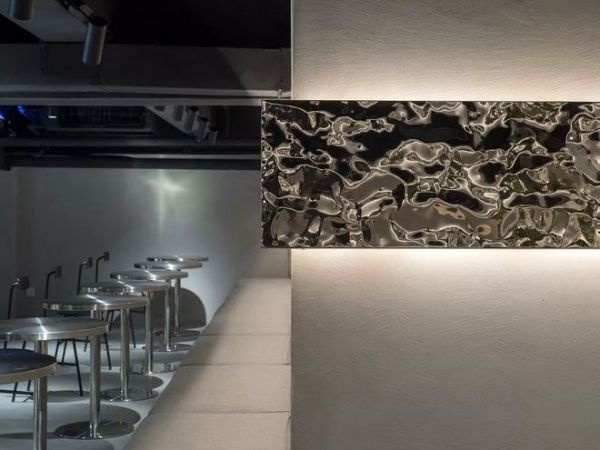 墙面则通过波浪不锈钢模拟水的波纹,更休闲的就餐姿态和视觉上的互动区别于传统餐饮体验,让人们就餐撸猫两不误。