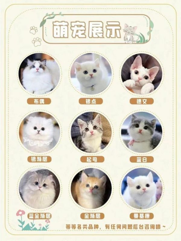 在售猫咪品种同样丰富多彩,包括但不限于:蓝猫、蓝白、蓝金、银渐层、金渐层、蓝金渐层、银点、金点、豹猫、布偶猫、缅因猫、曼基康、米努特、美短猫、起司猫、德文等各种珍稀品种。