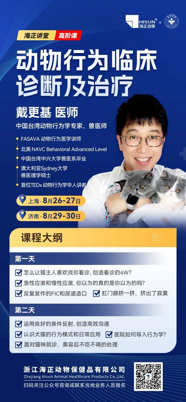 欢迎大家参加8月26-27日在上海、8月29-30日在济南举办的海正动保高阶课程,戴更基医师将带您一起探索关于动物行为临床诊断和治疗的知识世界!
