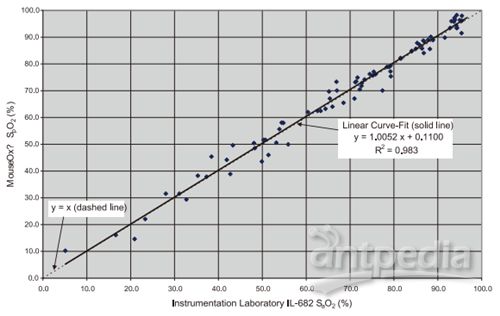 使用有创血气采样测量结果与无创 MouseOx 测量结果的比较, 对比表明, 两者具有很好的线性关系。